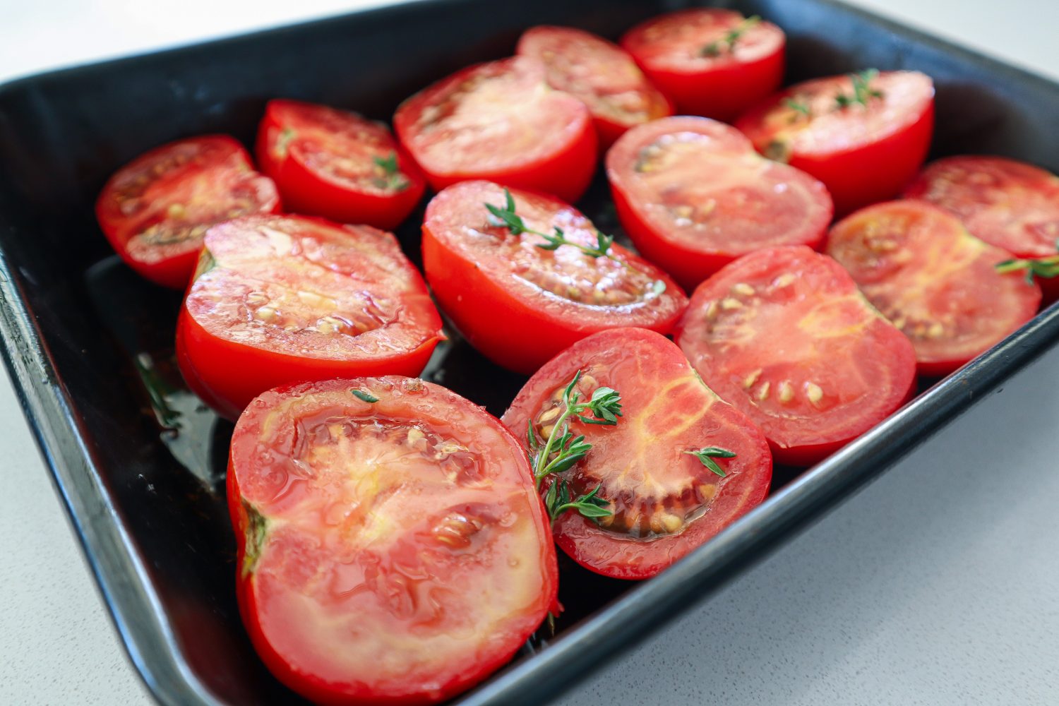 Cut tomatoes in half and add to the roasting dish skin side down. Add Garlic cloves (skin on) and thyme throughout the tomatoes.
