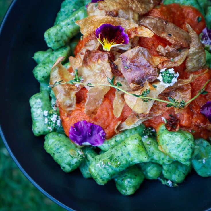 Soft pillowy spinach gnocchi with crispy potato skins. Serve with herbed butter or the simple roasted tomato sauce recipe. Delicious! Unlike most spinach varieties the NZ Spinach / Warrigal greens produce in abundance over the summer! This edible ground cover is a powerhouse in the garden and pairs well with so many dishes. Spinach gnocchi is so vibrant and delicious! Making gnocchi can seem scary but this recipe has just 4 ingredients and is so worth it! I have used NZ spinach but you could swap it out for regular spinach, chard, or any other leafy greens you have growing in the garden.