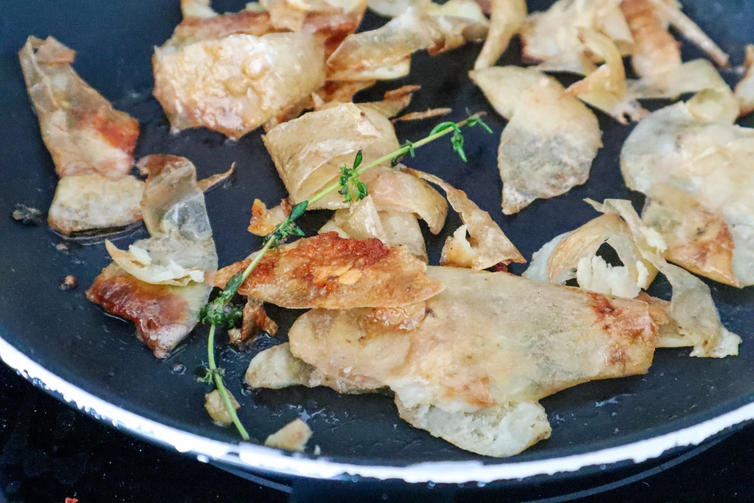 In a pan add butter and thyme and fry potato skins until crispy. Set aside.