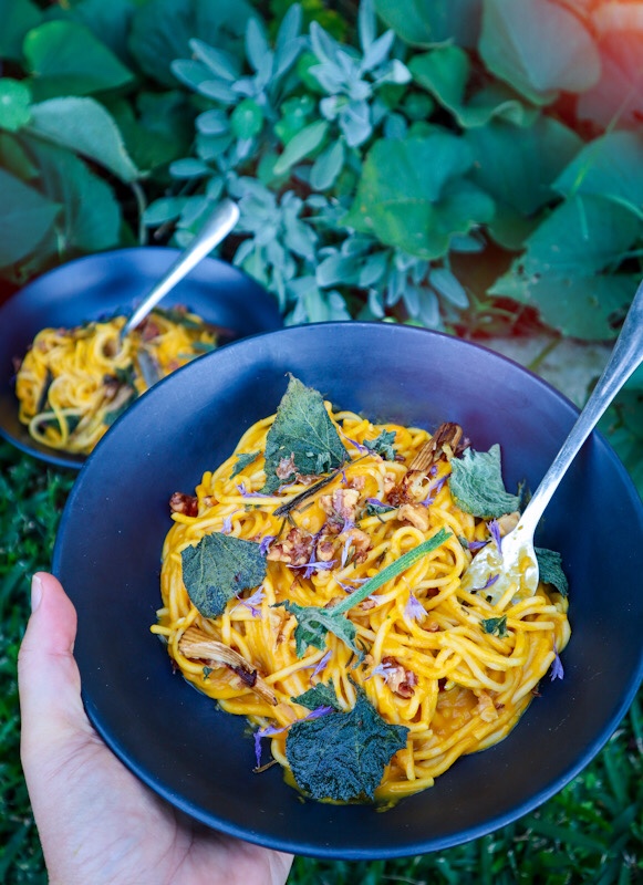 Creamy Roast Pumpkin Pasta with Crispy Pumpkin Leaves