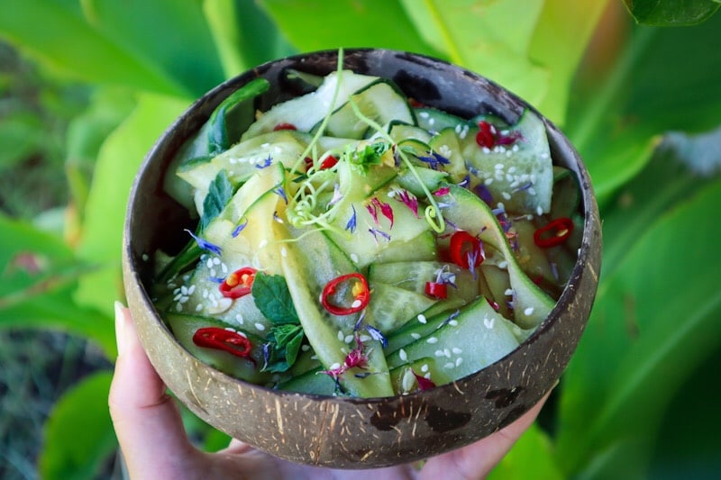 Cucumber salad is a quick and easy way to use up your summer harvests. This salad is a light and refreshing side dish that would go great with any summer BBQ or rice dish. Simple, vibrant, fresh ingredients are what make a salad!