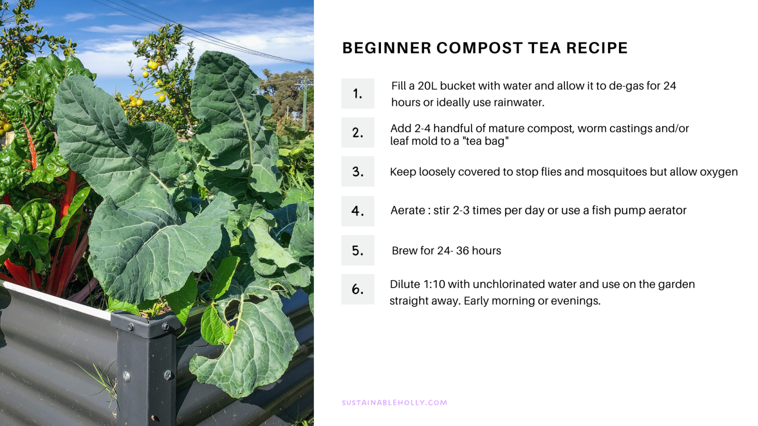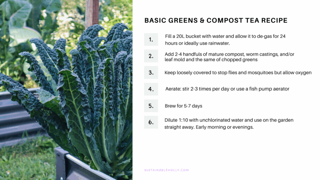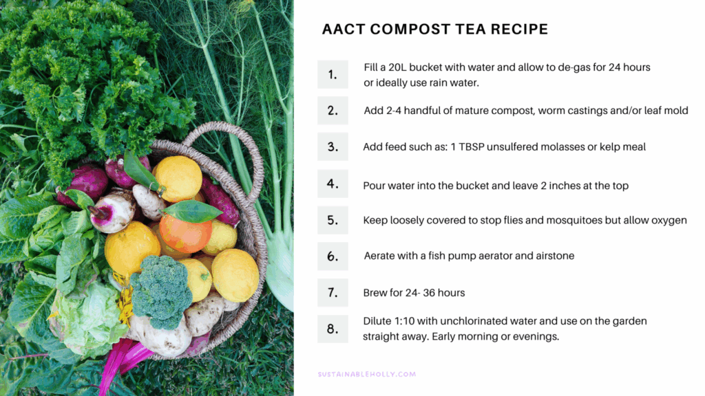 This is the process of adding oxygen to the mix which speeds up the process and encourages good bacteria to breed. You can use any fish pond or aquarium oxygenator or buy a specific compost tea oxygenator similar to this one. Adding oxygen to the fertilisers helps stop the mix from turning anaerobic and stinky.