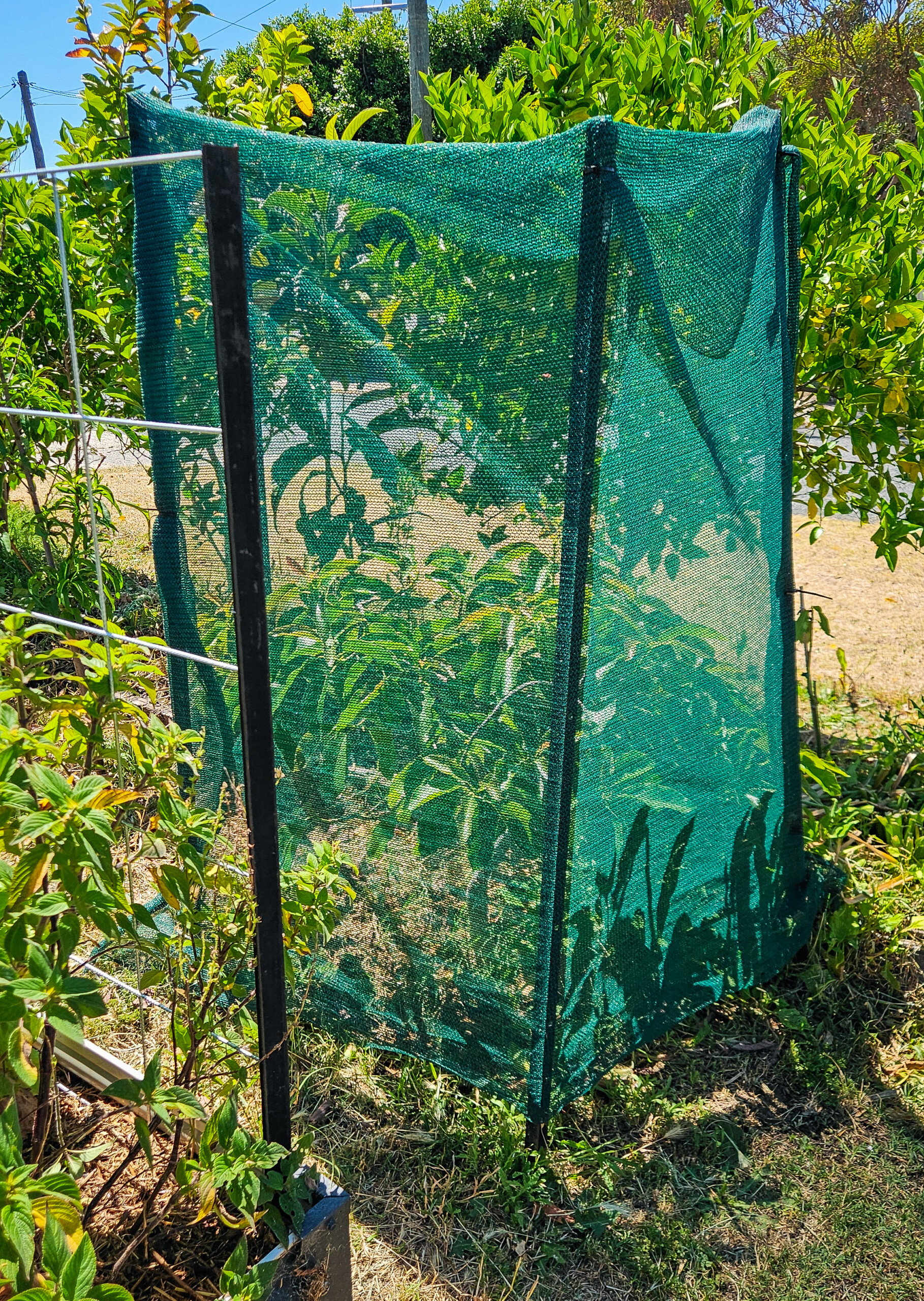 I prefer to use living windbreaks in the garden, but while I’m waiting for these to establish, I set up temporary relief around more vulnerable plants such as Avocados.