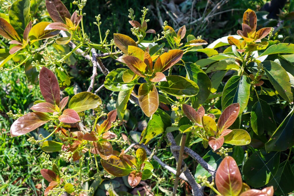 Avocado (Persea americana) – Large, soft leaves and shallow roots make it prone to leaf damage and windburn.