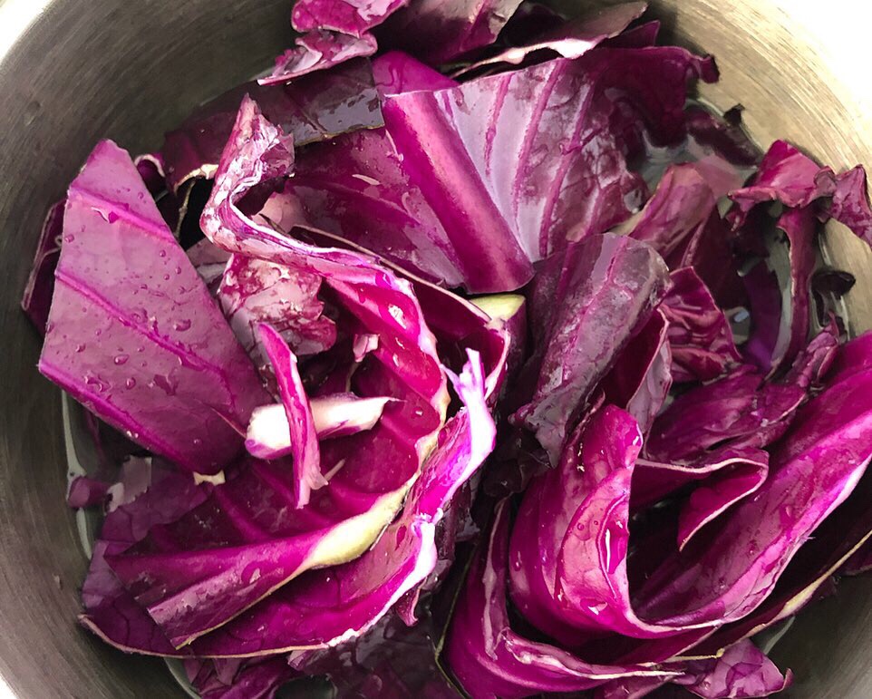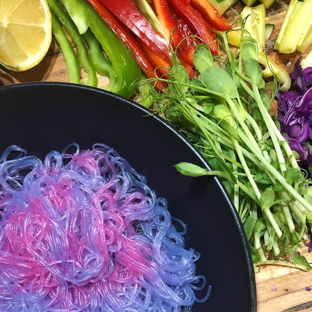 - Place your noodles in a bowl and before serving roughly squeeze the lemon over the purple noodles and the acidity will change the colour to pink.
